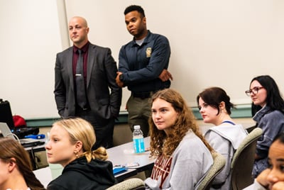 PA State Police Trooper Christopher Clinton ’10 leads the Police Theory vs. Practice course, where students take part in immersive simulations with his fellow officers. |